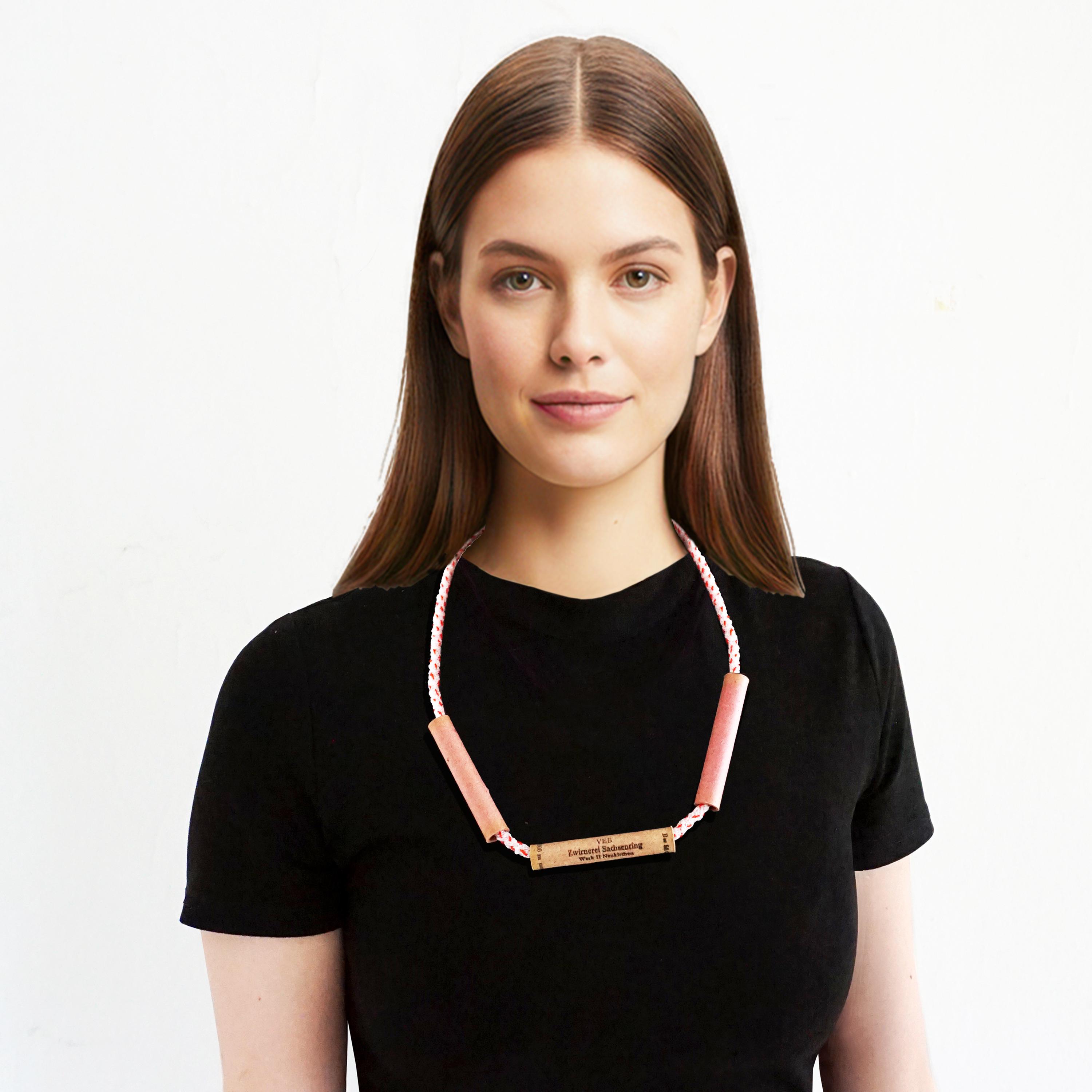 UNIKAT Halskette mit Vintage Garnrollen aus Pappe & upgecyceltem Synthetik-Halsband / UNICAT Necklace made with vintage cardboard spools and an upcycled synthetic ribbon