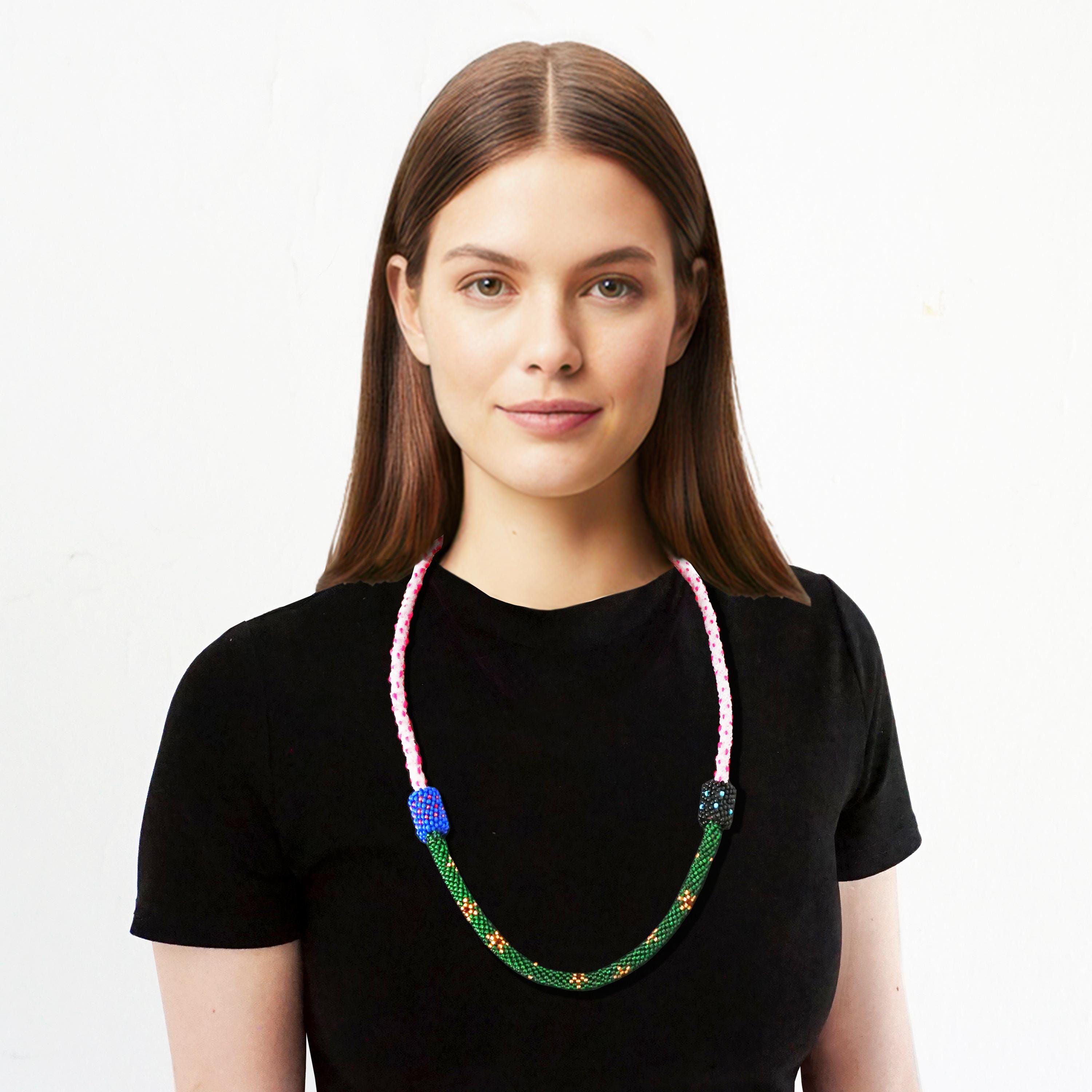 Farbige Halskette mit gehäkelten, bestickten Perlen und geflochtenem Band / Colored necklace with crocheted, embroidered beads and a braided cord