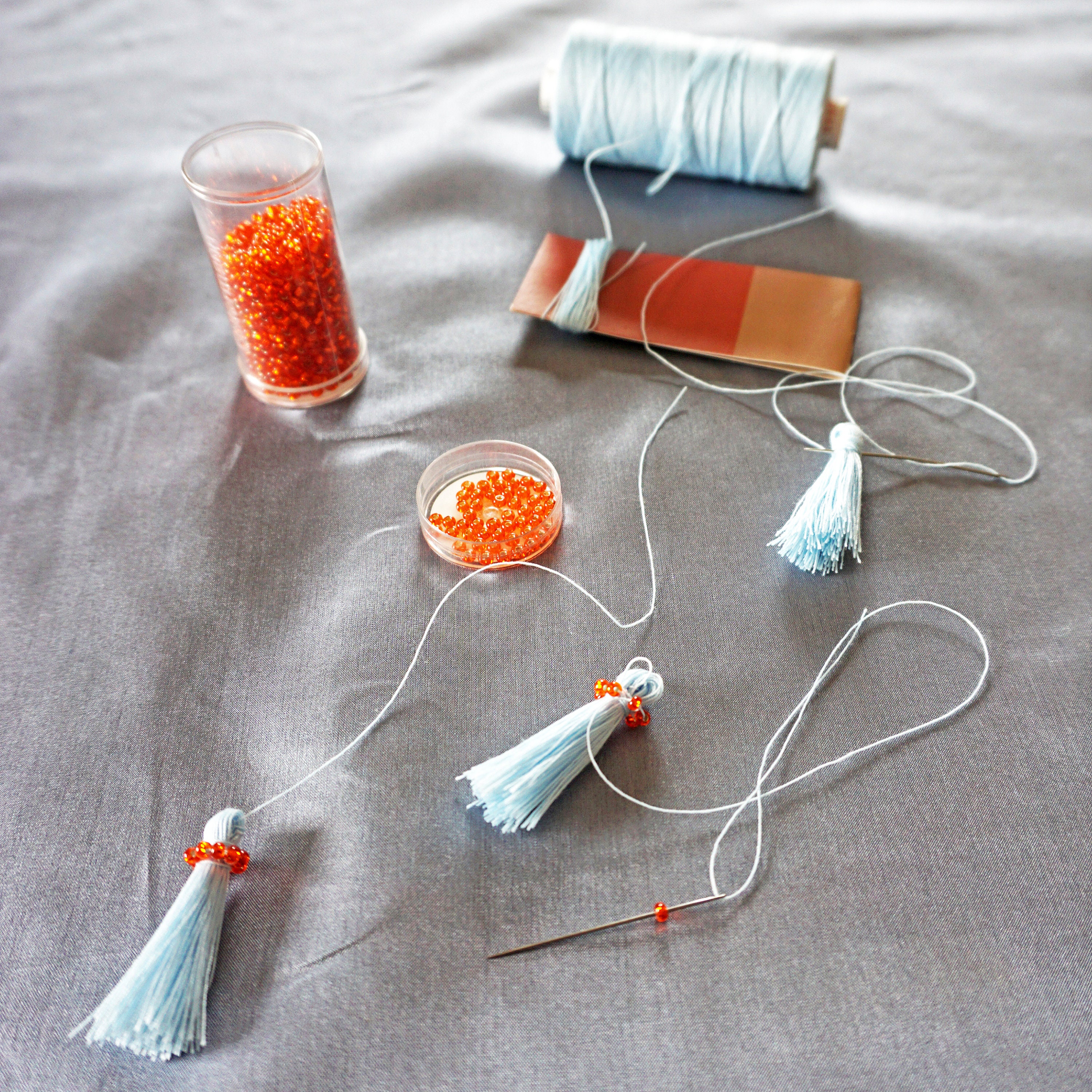 2. orange rolled hem with 4 handmade tassels (embroidered with beads)